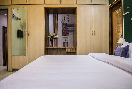 A large Double Bed AC Room with en suite bath. It's a Ground floor Room in an independent house. The room is furnished with Queen Size bed, sitting area, wardrobes. Ideal for families and independent travellers looking for a safe, clean stay. It's also great for long stays.